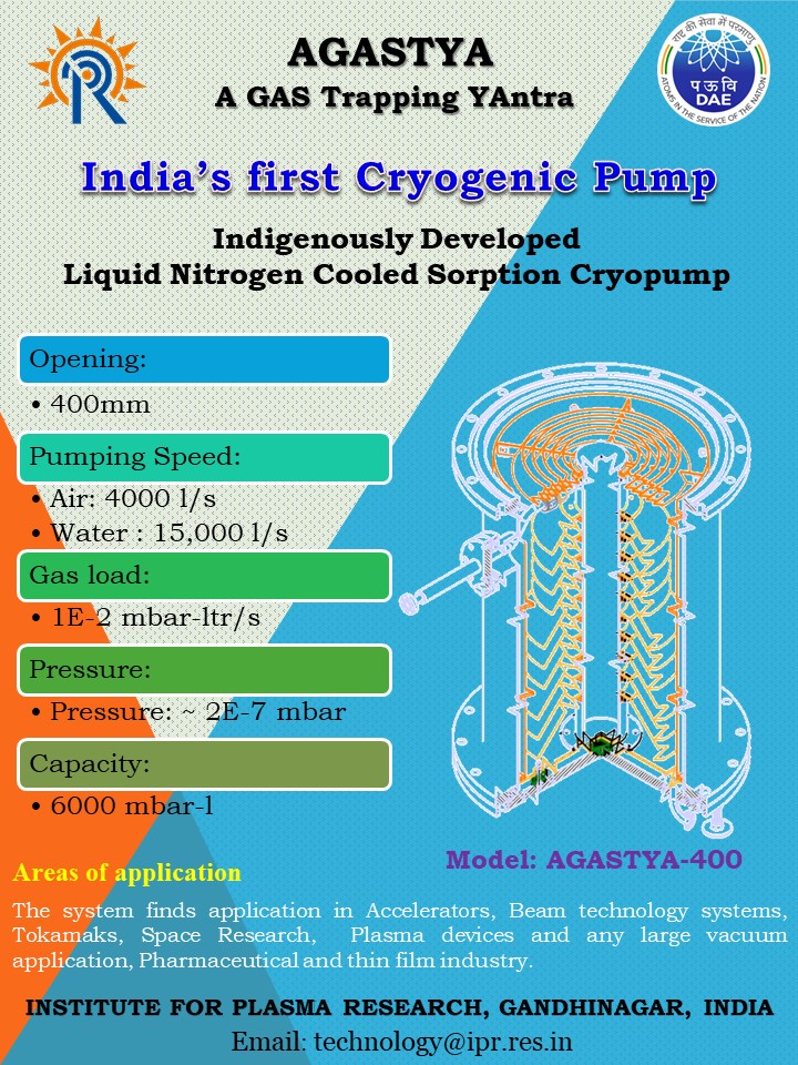 Specific to DAE the applications are to evacuate the large volume vessels in fusion machines (SST-1 & Aditya Tokamak at IPR), Accelerator Driven Systems, Vacuum and cryostat of ITER and LIGO beam technologies.