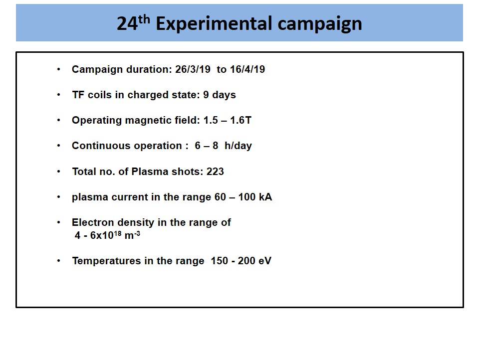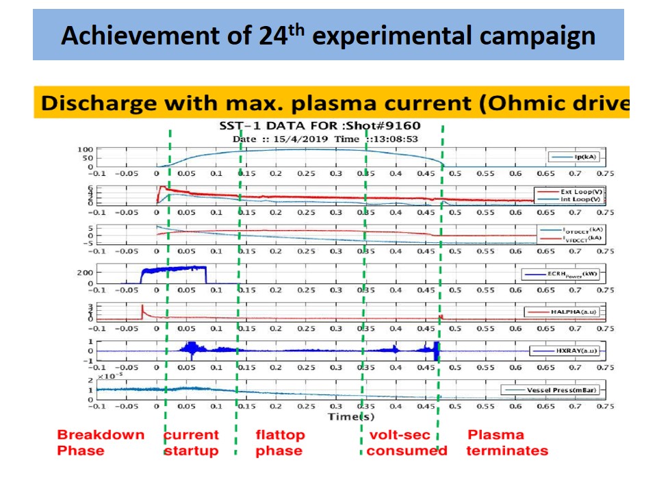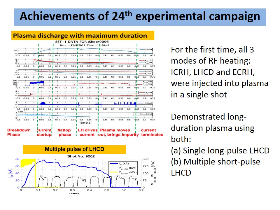 | SST-1 is a medium-size tokamak with a major radius of 1.1m and a minor radius of 0.2m. The toroidal magnetic field is routinely operated at 1.5T ( TF magnets are designed for 3T). ECR preionization and Ohmic system are used to achieve the 100kA plasma current up to 450ms in Ohmic-only scenarios. Launching the Lower Hybrid power of about 100kW has also been used to enhance the 80kA plasma of duration 650ms (limited due to the available equilibrium field provided by the external (Copper-based) vertical field).