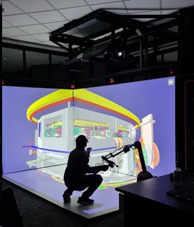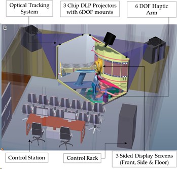 The facility comprises of 3 Sided display screens with projection systems, 6 DOF optical hand/head tracking system, haptic force feedback arm for interactions, 3D middleware application etc.
